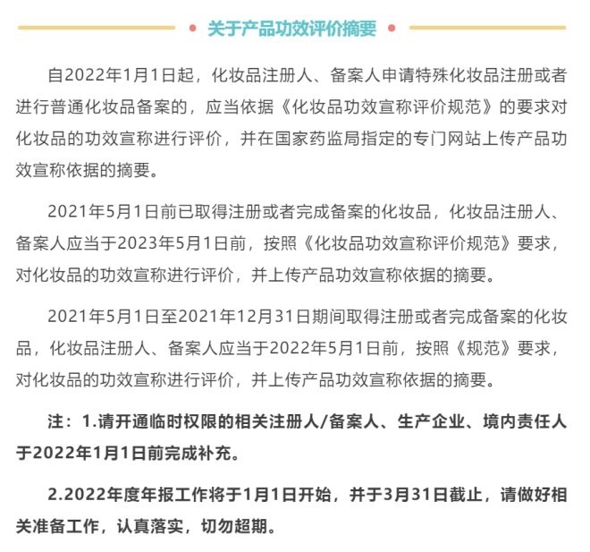 另外,《化妝品功效宣稱評價規(guī)范》還提到,“2021年5月1日至2021年12月31日期間取得注冊或者完成備案的化妝品,化妝品注冊人、備案人應(yīng)當(dāng)于2022年5月1日前,對化妝品的功效宣稱進(jìn)行評價,并上傳產(chǎn)品功效宣稱依據(jù)的摘要!闭蛉绱,不少美妝企業(yè)都在與時間賽跑,趕在今年年底完成產(chǎn)品備案。