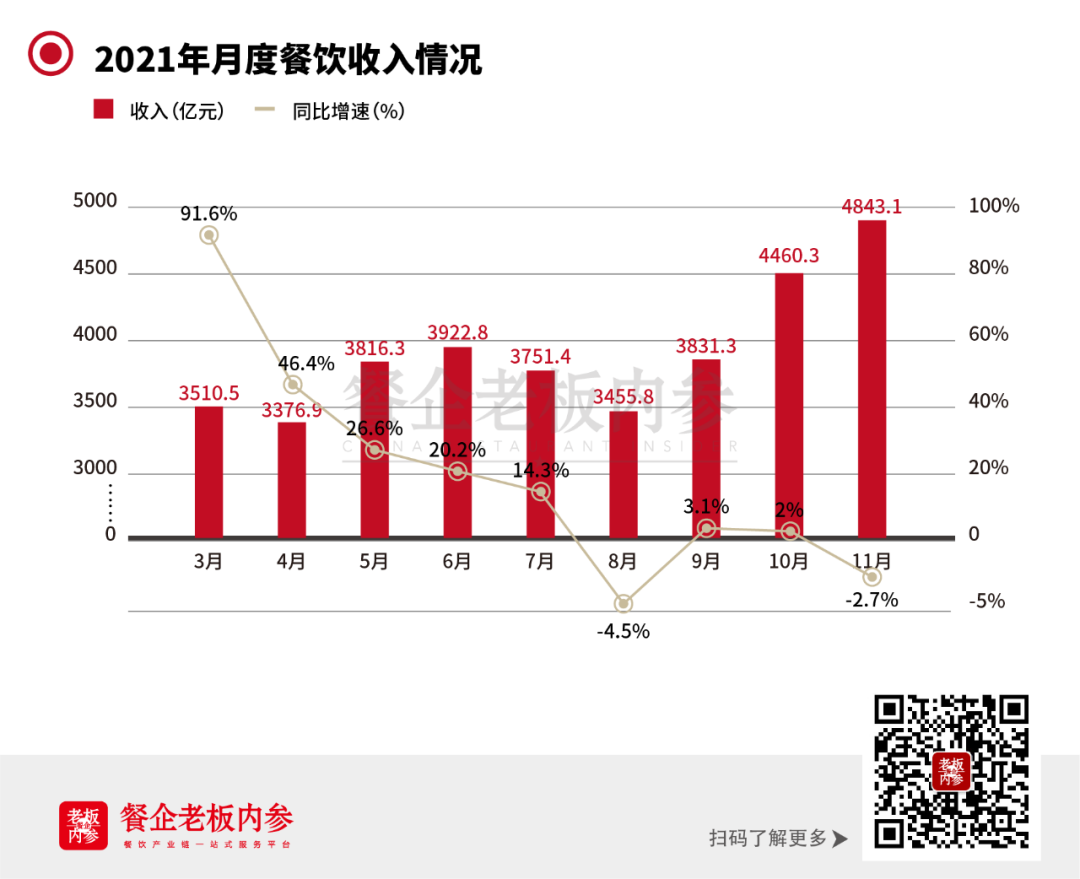 據(jù)國家統(tǒng)計局數(shù)據(jù),2021年前11個月餐飲收入總額42053.8億元,同比增長21.6%。從3月到11月,雖然沒有突出表現(xiàn),但整體平穩(wěn),且8月份之后,每個月的收入都在平緩增加。