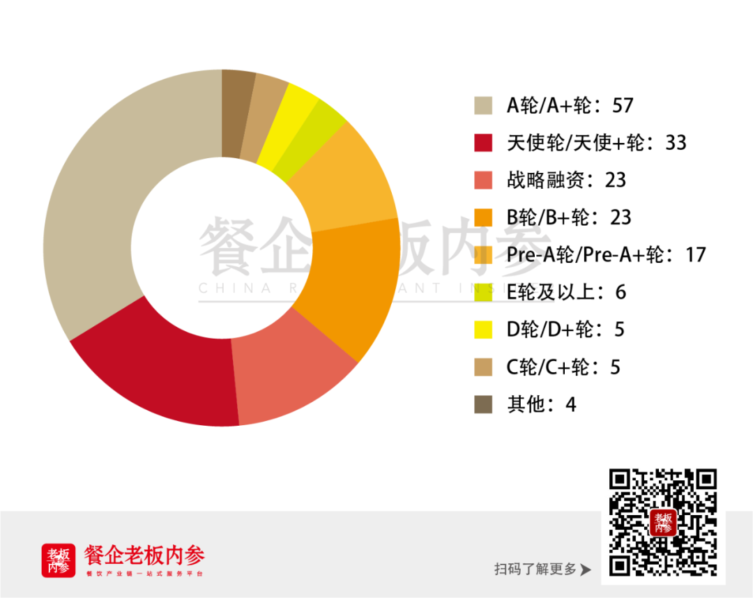 最后,從融資輪次看,A輪/A+輪共有57起,B輪/B+輪23起,占據(jù)整體比例46%,說明大部分餐飲品牌處于中速發(fā)展階段,而這些一定是極具發(fā)展?jié)摿蛯嵙,以及被資本青睞的品牌。