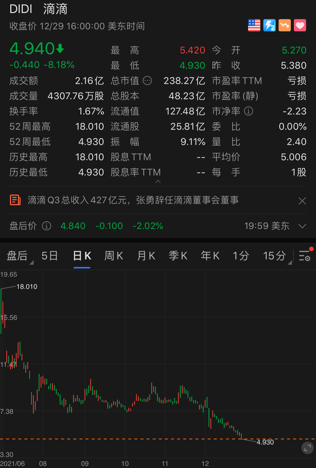 受上述消息影響,當(dāng)?shù)貢r(shí)間12月29日,滴滴美股報(bào)收4.94美元/股,較前一日股價(jià)下跌8.18%。