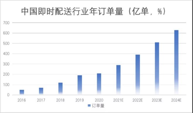 圖:中國(guó)即時(shí)配送行業(yè)年訂單量(來(lái)源:艾瑞咨詢,新眸繪制)