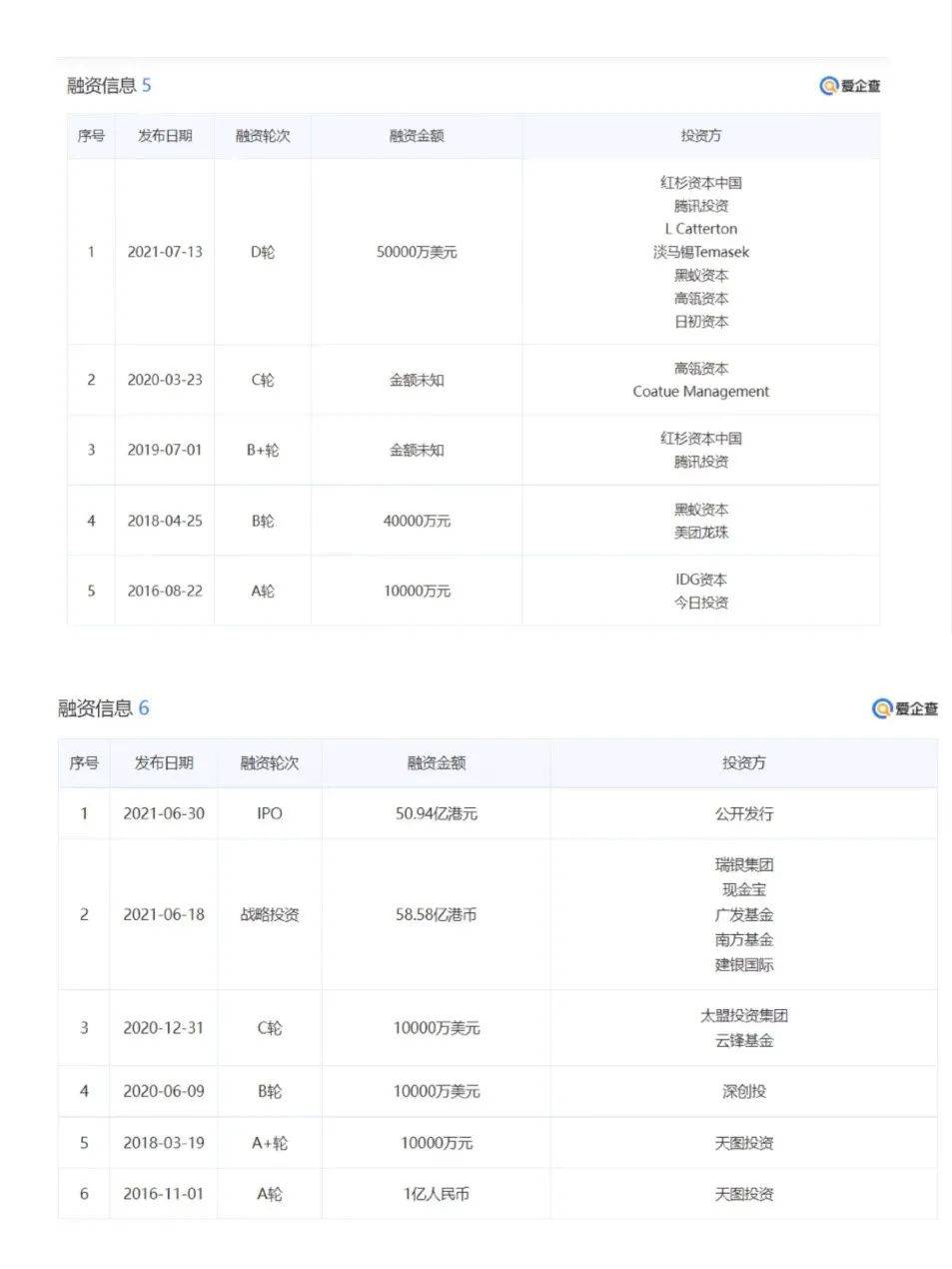 上下分別為喜茶、奈雪的茶融資進程