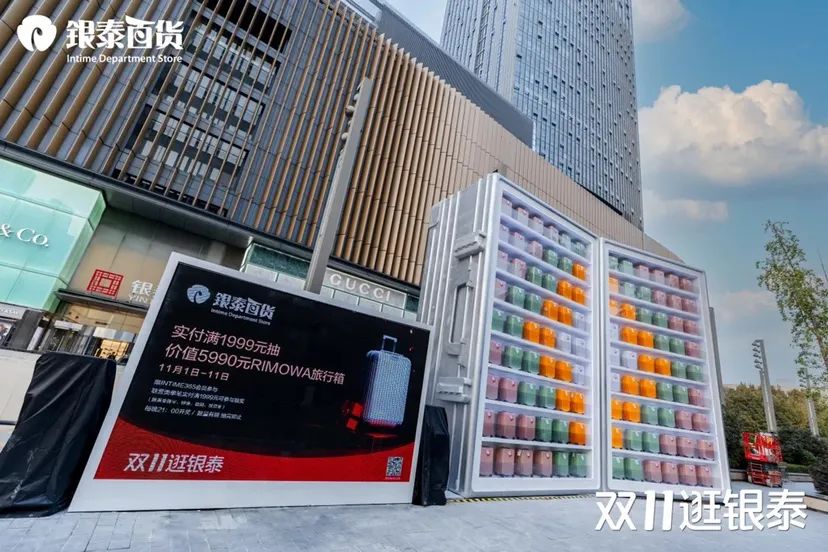 今年11月,奢侈品品牌RIMOWA用108個(gè)行李箱在合肥銀泰中心做的行李箱展,成功霸屏社交媒體,這份“銀泰的禮物”成為社交達(dá)人的最佳拍照打卡點(diǎn)。