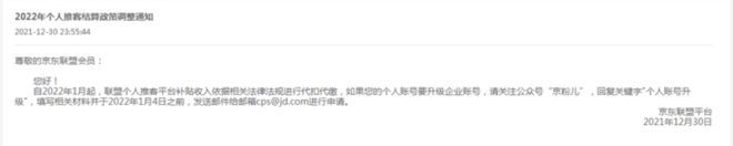 通知還強(qiáng)調(diào),“如果您的個人賬號要升級企業(yè)賬號,可以關(guān)注公眾號‘京粉兒’,回復(fù)關(guān)鍵字‘個人賬號升級’,填寫相關(guān)材料并于 2022年1月4日之前,發(fā)送郵件給郵箱cps@jd.com進(jìn)行申請!