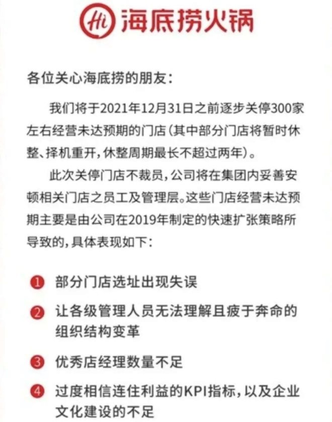 海底撈關(guān)店公告 來源 / 微博