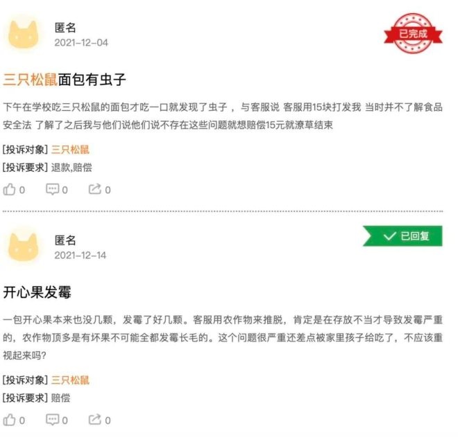 在此之前,網(wǎng)紅零食品牌“三只松鼠”也被曝存在變質(zhì)、發(fā)霉等情況。在黑貓投訴平臺上,三只松鼠、良品鋪子、百草味等零食品牌,都有超1000條投訴,內(nèi)容大多與食品中有異物、異味等質(zhì)量問題有關(guān)。
