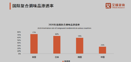 做飯離不開調(diào)味品,所以調(diào)味品也被稱為飯菜中的靈魂。據(jù)艾媒網(wǎng)發(fā)布的《2020-2021年中國調(diào)味品行業(yè)研究報(bào)告》顯示,調(diào)味品市場越發(fā)成熟,復(fù)合調(diào)味品的滲透率隨之提升,到2020年,美國、日本、韓國復(fù)合調(diào)味品占比分別為73%、66%、和59%,而中國復(fù)合調(diào)味品滲透率僅為26%,有巨大的增長空間。