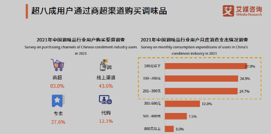 艾媒網(wǎng)數(shù)據(jù)顯示,2021年中國調(diào)味品行業(yè)用戶購買渠道調(diào)查顯示,商超占83%,線上渠道占43.6%(包括重合部分),F(xiàn)階段短視頻助力品牌發(fā)展,除了現(xiàn)有的線下渠道,線上也將會(huì)成為復(fù)合調(diào)味品增長的關(guān)鍵通道。