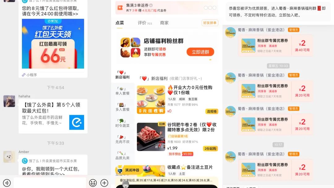 美團(tuán)還開(kāi)通了粉絲群功能,美團(tuán)買藥推出了專屬私域會(huì)員系統(tǒng),只是目前開(kāi)通并真正運(yùn)用好粉絲群的商家相對(duì)較少。餓了么則在微信企業(yè)號(hào),干起了外賣優(yōu)惠券微信群,通過(guò)人工運(yùn)營(yíng)來(lái)找到增長(zhǎng)突破口。二者在私域方面的探索還處于初期階段。
