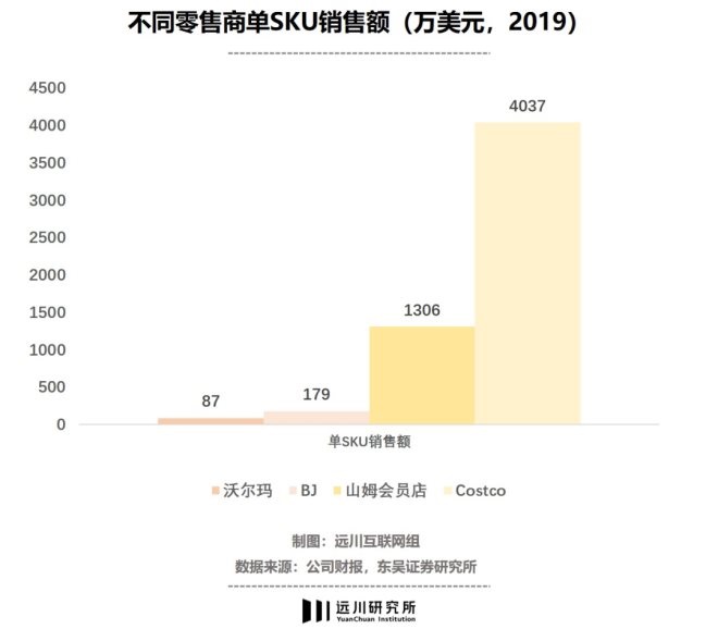 Costco的SKU在3700左右,只有沃爾瑪(2萬)的五分之一。品類雖少,單品規(guī)模卻高一籌。2019年,Costco單個(gè)SKU的銷售額超過4000萬美元,遠(yuǎn)高于沃爾瑪?shù)?7萬美元。