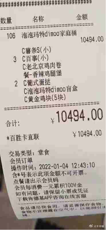 不過(guò),這些都還只是普通玩家,一張流傳更廣的票據(jù)顯示,一位“王者玩家”一次性花費(fèi)10494元購(gòu)買了106份套餐。根據(jù)一份套餐中有三杯小可樂(lè)計(jì)算,光可樂(lè)就足夠這位買家喝一年了。