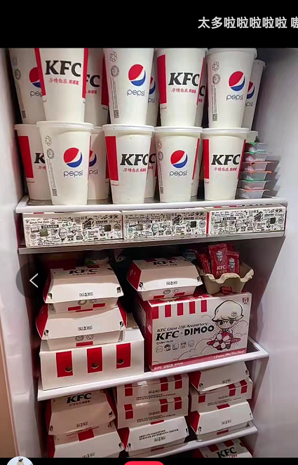 這種整盒購(gòu)買的情況,被稱為“連盒端”。多數(shù)潮玩玩家,為了集齊一整套,都會(huì)選擇連買6份。于是,不少網(wǎng)友實(shí)現(xiàn)了“肯德基自由”,有人分享了自家冰箱被肯德基塞滿的場(chǎng)景,有人拎著18杯可樂(lè)被保安當(dāng)成了外賣小哥,有玩家則曬出用推車采購(gòu)的圖片……