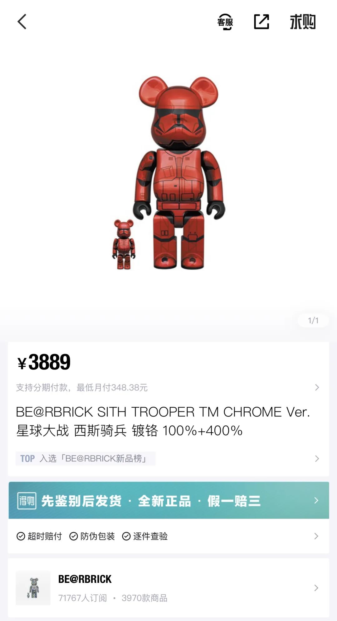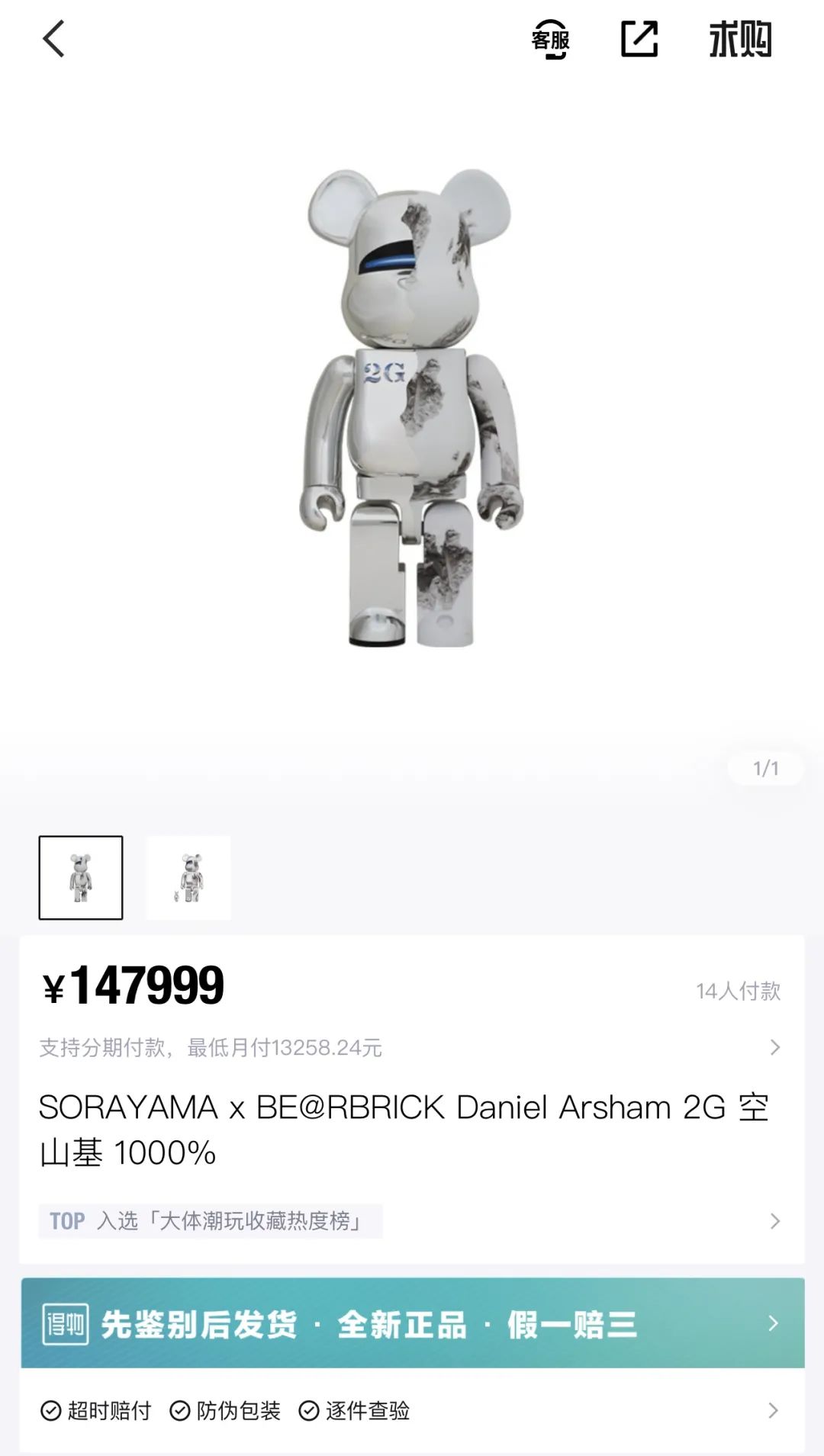 根據(jù)尺寸不同,積木熊的官方售價(jià)一般在幾十元到幾千元之間。但在某鑒定交易平臺(tái)上,幾乎沒(méi)有積木熊按照原價(jià)出售。最貴的一款“SORAYAMA X BE@BRICK Daniel Arsham 2G 空山基 1000%”售價(jià)147 999,但其發(fā)售價(jià)僅有8 800。而去年12月剛發(fā)售的“星球大戰(zhàn)西斯騎兵鍍鉻100%+400%”發(fā)售價(jià)僅1 000人民幣左右,該交易平臺(tái)已經(jīng)要價(jià)3 889。