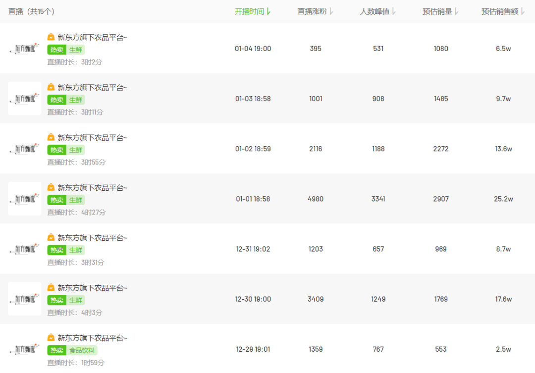 從直播數(shù)據(jù)來看,從12月28日起密集開播,東方甄選基本保持每天3到4個(gè)小時(shí)的直播時(shí)長(zhǎng)。但直播成績(jī)并不亮眼,場(chǎng)觀人次基本不過10萬,銷售額在20萬上下。飛瓜數(shù)據(jù)顯示,從12月29日到1月4日的7場(chǎng)直播,總計(jì)銷售額不足90萬。