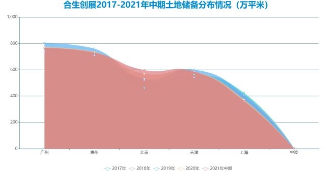 從土地儲備上看,合生創(chuàng)展土儲規(guī)模始終穩(wěn)定在3000萬平方米左右。2021年中期,這一數(shù)值為3048萬平米,主要分布于廣州、惠州、北京、天津、上海等城市。
