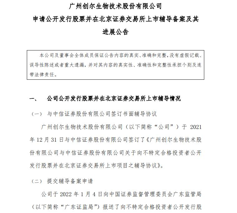 根據1月4日,該公司發(fā)布的另一則公告,創(chuàng)爾生物已向廣東證監(jiān)局報送了向不特定合格投資者公開發(fā)行股票并在北交所上市輔導備案材料,輔導機構為中信證券。公告稱,該公司2019年度、2020年度的凈利潤分別為 6257.95萬元、7819.79萬元,加權平均凈資產收益率分別為37.23%、34.88%,符合在北交所上市的財務條件。