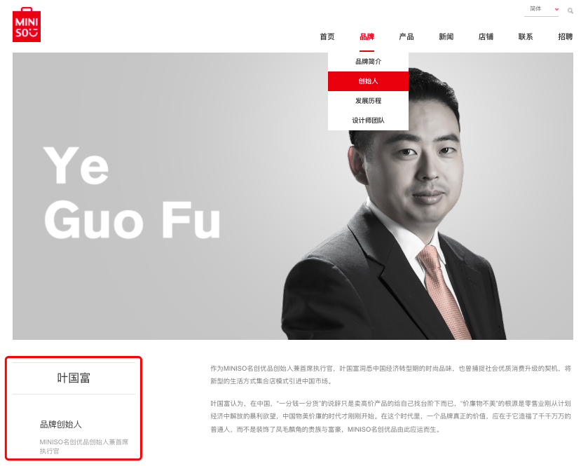 2020年9月,名創(chuàng)優(yōu)品中文版官網界面(百度快照)顯示,名創(chuàng)優(yōu)品是由中國青年企業(yè)家葉國富先生于2013年開始經營,中國總部位于廣東省廣州市。