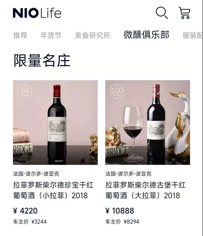 造車新勢力中,蔚來則是更高端的玩家,在其APP中,設(shè)置了8大門類,包括美食研究所、微醺俱樂部、服裝配飾、家居日用、運動戶外、旅行箱包、科技數(shù)碼、車模玩具,從生巧、果仁盲盒、曲奇餅干等美食,到售價188元~10888元不等的各式紅酒,還有餐具、天文望遠鏡等,周邊產(chǎn)品多達上千款。有數(shù)據(jù)顯示,蔚來NIO Life全球范圍內(nèi)擁有超過30個國籍的500余名設(shè)計師,三年時間里,開發(fā)了813件產(chǎn)品,有280萬件出貨量,覆蓋全球340個城市。