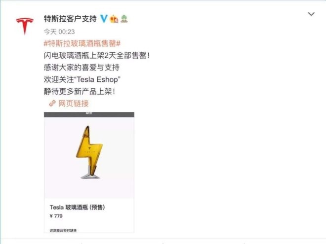 今年的雙十一預(yù)售活動中,特斯拉在天貓上掛了這款空酒瓶,售價為779元,限量1500個,且“售完無補”,并且宣稱“具備收藏價值”。目前這款商品已經(jīng)售空下架。
