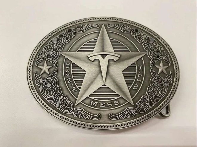 在特斯拉官網(wǎng)的介紹中,它是這樣的:這款皮帶扣采用精巧設(shè)計,一個醒目的T型標志嵌在“德州孤星”當中。每一款皮帶扣均由壓鑄鋅制成,在鐫刻后刷上古董銀色飾面。注意:最多可搭配2英寸腰帶。
