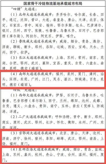 4月14日上午,福州現(xiàn)代物流城項目招商簽約儀式,8個項目集中簽約,總投資186.86億元。分別是:民天國際商貿(mào)交易中心、豐樹福州食品智能生產(chǎn)物流基地、中科(福州)國際智能港、永輝博鴻達(dá)福建冷鏈肉品智慧交易平臺、雨潤集團(tuán)福州食品研發(fā)生產(chǎn)基地、宇培供應(yīng)鏈福建省運營中心、復(fù)星國藥智慧醫(yī)藥倉儲物流服務(wù)平臺、新能源光伏發(fā)電項目。11月29日,國家發(fā)改委公布了“十四五”首批國家物流樞紐名單25個,福州市以商貿(mào)服務(wù)型國家物流樞紐成功入榜,是繼廈門港口型國家物流樞紐后福建省第二入圍的城市。年底,國家發(fā)改委印發(fā)《國家骨干冷鏈物流基地建設(shè)實施方案》(發(fā)改經(jīng)貿(mào)﹝2021﹞1809號),對“十四五”時期國家骨干冷鏈物流基地布局建設(shè)作出“四橫”“四縱”系統(tǒng)安排。其中福州、泉州、廈門、漳州入選南部大通道承載城市,福州、廈門入選京鄂閩大通道承載城市以及東部沿海大通道承載城市。