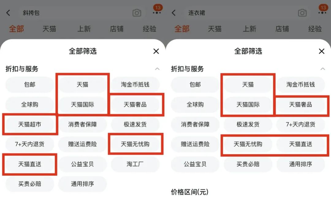 不同類目下,篩選項(xiàng)中均有很多天貓業(yè)務(wù)