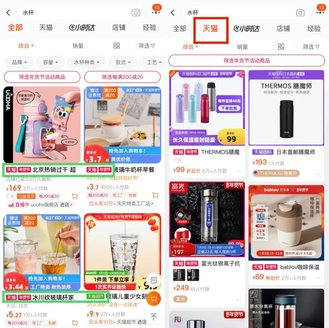 淘寶搜索結(jié)果前排均為天貓店鋪;淘寶第二欄為天貓欄