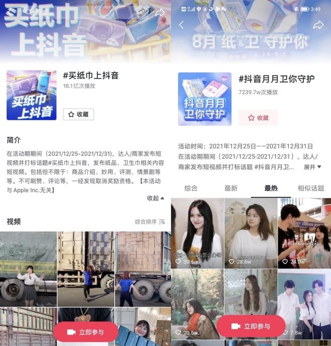 “‘紙’‘衛(wèi)’守護你”系列活動相繼推出了短視頻挑戰(zhàn)賽、短視頻點贊大賞等多種玩法及#買紙巾上抖音、#抖音月月衛(wèi)你守護兩大話題,幫助紙衛(wèi)品商家拓展消費人群。該兩大話題之下,聚攏了眾多紙衛(wèi)品商家花式展示自家產(chǎn)品的高品質(zhì)。截止目前,“買紙巾上抖音”下的短視頻播放量已超16.1億次;“抖音月月衛(wèi)你守護”話題已獲超7千萬次播放。