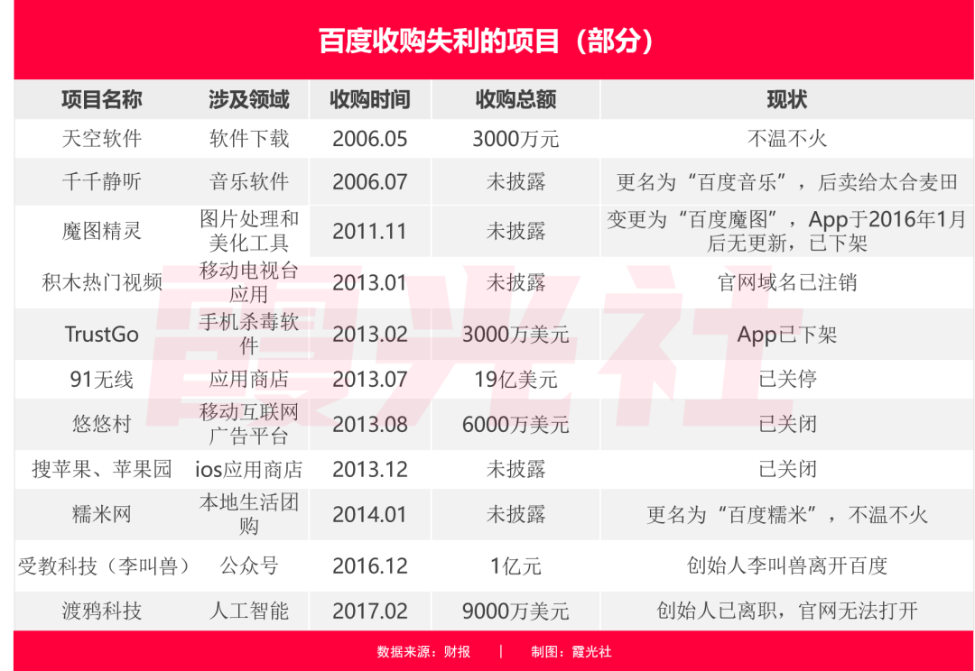 霞光社整理了一份百度收購失利案例表?梢钥吹,在百度收購的項目中,至少有7家已經(jīng)停止了運營。