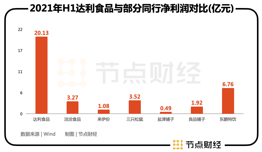 但是,對于2021年半年報凈利潤達(dá)到20.13億元的食品飲料大廠來說,這樣的估值水平又顯得有些“擰巴”。同期洽洽食品、三只松鼠、鹽津鋪?zhàn)、良品鋪(zhàn)印?a href=http://t.linkshop.com/kindex_id_1523.aspx target=_blank class=hotwords>來伊份、東鵬特飲等A股知名同行綁到一塊,還不如達(dá)利食品一家賺得錢多。