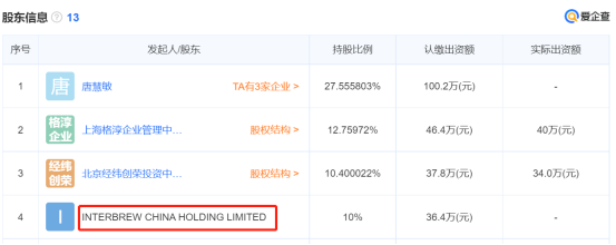 愛企查數據顯示,格英(上海)品牌管理有限公司于近日發(fā)生了股權變更,新增股東為INTERBREW CHINA HOLDING LIMITED(英特布魯中國),出資比例達到10%。