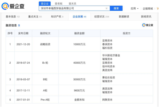 如今新零售一體的幸福西餅,也正在被資本所看好。愛企查數(shù)據(jù)顯示,幸福西餅近期獲得1億元人民幣融資,投資方為亞商資本、春澗資本與福杉投資。