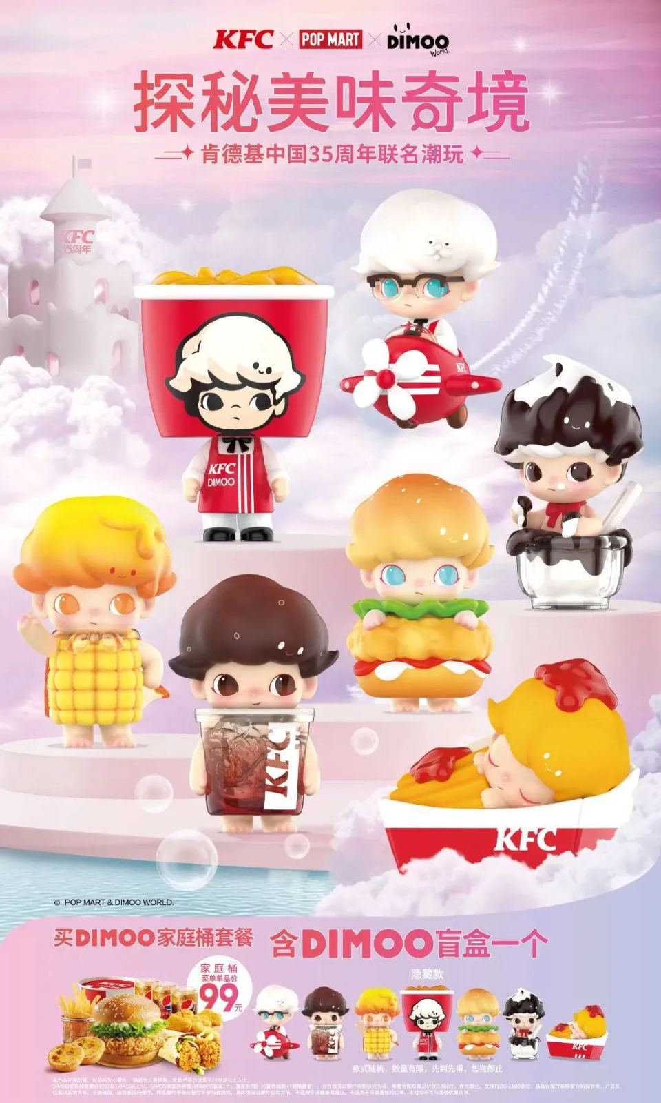 1月4日,在進入中國35周年之際,肯德基推出了和Dimoo的聯(lián)名款盲盒。頭頂百變云朵,雙眼中透露出對世界充滿好奇的小男孩Dimoo,是泡泡瑪特最受歡迎的五大頭部IP之一。