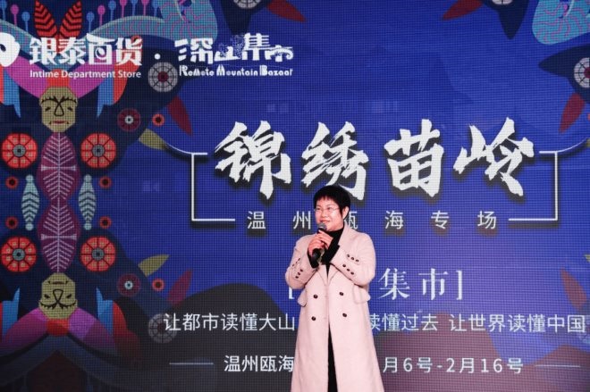 依文·中國手工坊副總裁劉文玲在開集儀式上致辭:“這是深山集市首次來到溫州,來到銀泰百貨。在這里,我們真切感受到了您們的溫暖和熱情。在過去的十八年里,我們一直奔走在大山里,為深山手藝人努力前行,把中國傳統(tǒng)手工藝帶出大山、帶進都市,融合現(xiàn)代設(shè)計理念,對接時代時尚潮流,以全新的姿態(tài)向世界展現(xiàn)中國傳統(tǒng)手工之美。您們的每一次購買,都是對中國傳統(tǒng)手工藝的支持,也是對繡娘的鼓勵。這次,深山集市聯(lián)合銀泰百貨,在這一個多月時間里,為您們帶去一場有情懷、有誠意的手工美學(xué)之旅。未來,我們要攜手銀泰百貨,繼續(xù)和繡娘一起,將深山手作和現(xiàn)代美學(xué)有機結(jié)合在一起,依托有溫度、有情懷的商業(yè)模型,讓更多深山手藝人能夠依靠雙手改變命運,過上更好的生活。”
