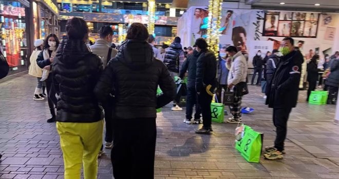 兩個(gè)黃牛坐在B&C門口休息區(qū),其中的大姐正在發(fā)牢騷,抱怨店員把她趕出門。