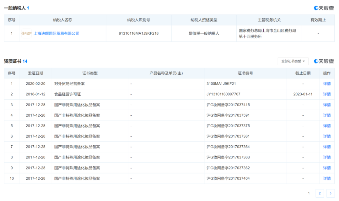 更讓人意外的是,根據(jù)企查查的信息,這家為燕之屋生產(chǎn)燕窩月餅和粽子的上海訣麒國(guó)際貿(mào)易有限公司,其主營(yíng)業(yè)務(wù)是生產(chǎn)并銷售化妝品,擁有十幾條化妝品相應(yīng)的備案信息。另外,這家公司雖然擁有食品經(jīng)營(yíng)許可證,但僅涉及食品的銷售,不涉及食品的生產(chǎn)。