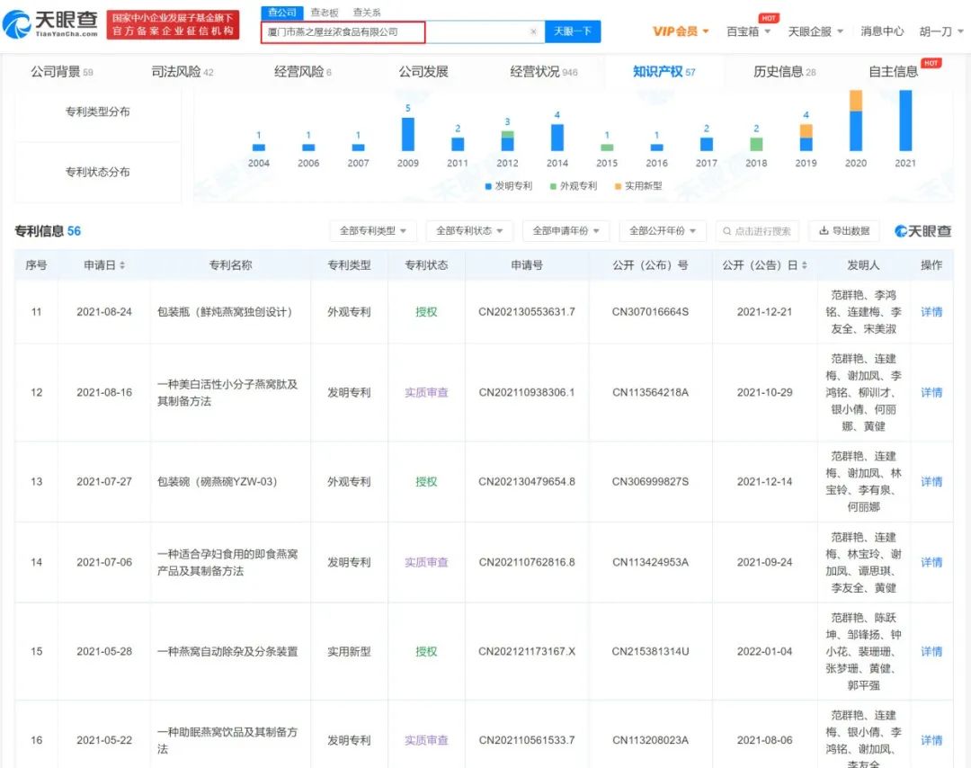 然而,天眼查的相應(yīng)數(shù)據(jù)顯示,此次上市的主體廈門燕之屋生物工程股份有限公司并沒有申報(bào)這些專利和相應(yīng)科研成果,燕之屋真正的運(yùn)營(yíng)實(shí)體是由這家上市公司全資控股的子公司——廈門市燕之屋絲濃食品有限公司。