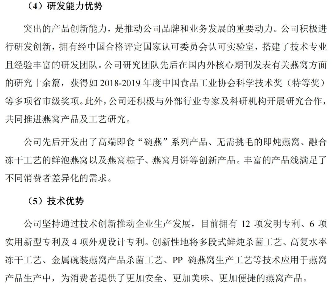 根據(jù)燕之屋的表述,公司研發(fā)團(tuán)隊(duì)擁有核心期刊刊發(fā)的論文十幾篇,擁有12項(xiàng)發(fā)明專利,6項(xiàng)實(shí)用新型專利及4項(xiàng)外觀設(shè)計(jì)專利,獲得如“2018-2019年度中國(guó)食品工業(yè)協(xié)會(huì)科學(xué)技術(shù)獎(jiǎng)(特等獎(jiǎng))”等多項(xiàng)省市級(jí)獎(jiǎng)項(xiàng)。