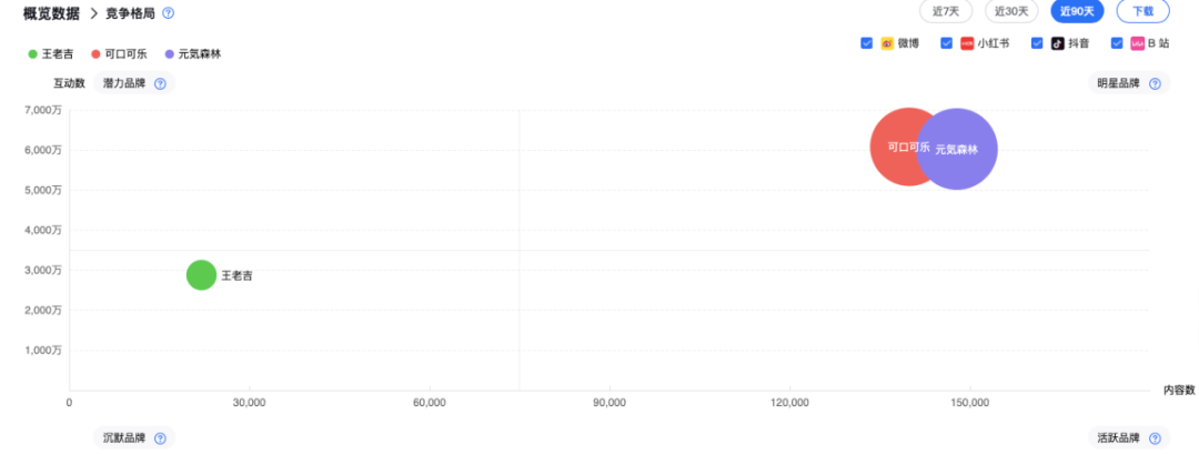 在洞察引擎的競(jìng)爭(zhēng)態(tài)勢(shì)中也可以看到,王老吉與飲料頭部品牌可口可樂(lè)、新消費(fèi)品牌元?dú)馍謱?duì)比,在市場(chǎng)競(jìng)爭(zhēng)格局上存在著較大的差距。