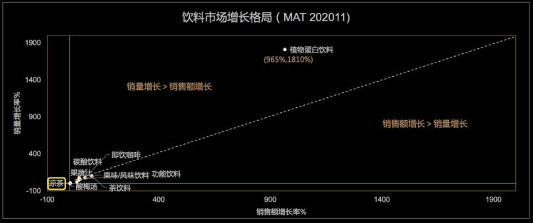 根據(jù)天貓新品創(chuàng)新中心公布的報(bào)告,在所有飲料品類(lèi)中,涼茶增長(zhǎng)格局略顯尷尬,整體銷(xiāo)量增長(zhǎng)率和銷(xiāo)售額增長(zhǎng)率處于幾乎墊底的位置。