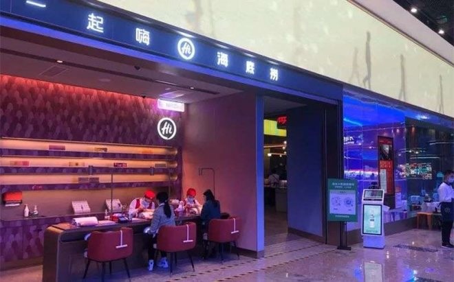 繼粉色主題店后,近日,餐見君發(fā)現(xiàn)海底撈有門店悄悄變藍(lán)了。
