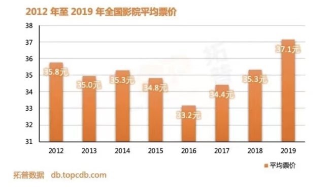 來源 / 拓普電影數(shù)據(jù)庫2012年-2019年全國影院平均票價趨勢圖