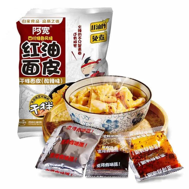 阿寬食品迅速增長的主要單品為代表產(chǎn)品“紅油面皮”系列,其主打“寬面皮,更有勁兒” “四川特色” “非油炸”等特點(diǎn),與傳統(tǒng)方便面在形態(tài)、口味、工藝等方面均存在顯著不同,與市場上其他方便食品形成差異化競爭,一時(shí)得到消費(fèi)市場的追捧。