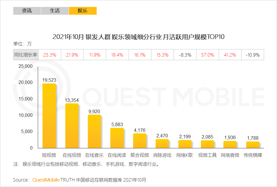 2021年10月銀發(fā)人群娛樂領(lǐng)域細(xì)分行業(yè),圖/QuestMobile