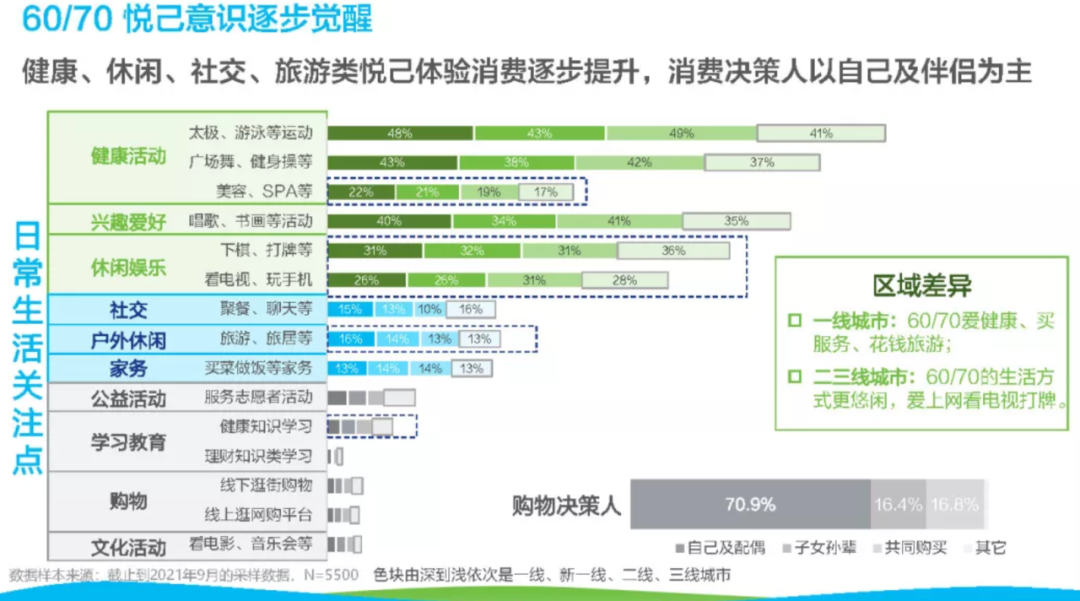 隨著進(jìn)入退休生活,老年人的時(shí)間和精力得到了解放。根據(jù)AgeClub日前發(fā)布的《中國式養(yǎng)老真相洞察健康個(gè)護(hù)報(bào)告》,60、70后悅己意識(shí)逐步覺醒,健康、休閑、社交、旅游類悅己體驗(yàn)消費(fèi)逐步提升。