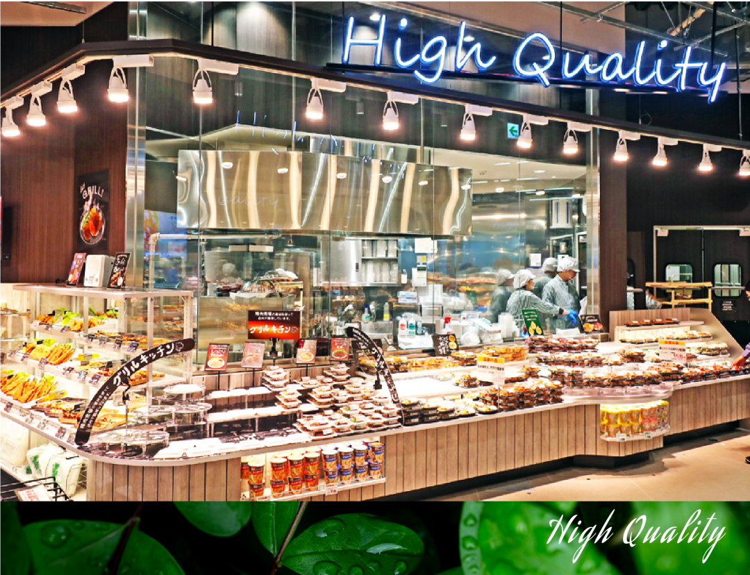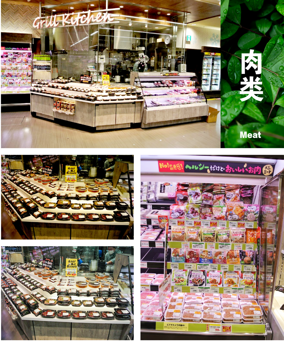 3) 將生鮮品類的熟食分散布置在各個(gè)賣場(chǎng),如蔬果的沙拉果切區(qū)(Fresh Salad & Cut Fruit)、水產(chǎn)的食魚廚房(Osakana Kitchen)、肉類的現(xiàn)烤廚房(Grill Kitchen)