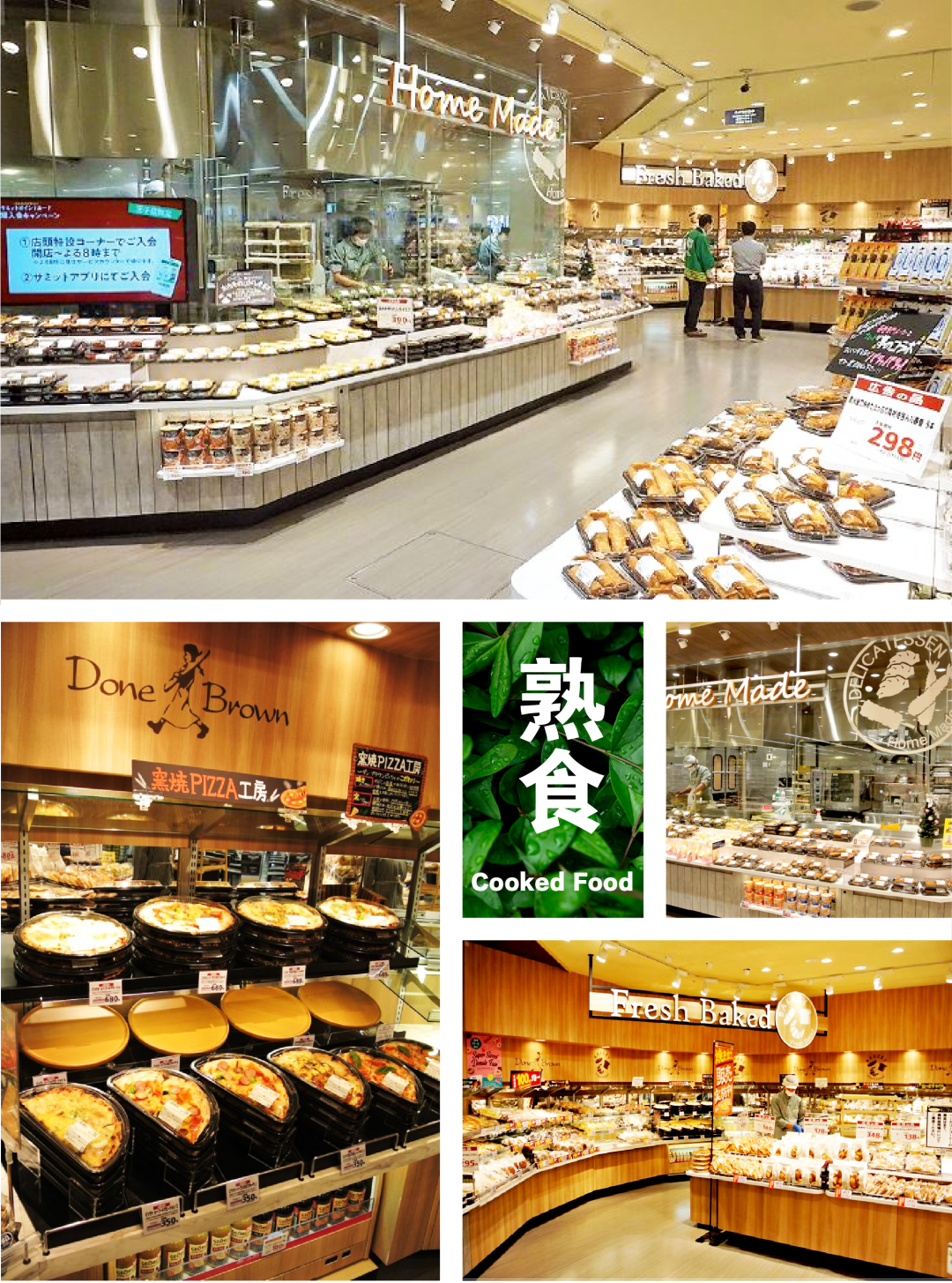 熟食部門以店內(nèi)銷售的生鮮食材為原料,在可視化的加工間內(nèi)現(xiàn)場(chǎng)手工制作。針對(duì)家庭顧客推出漢堡餅、甜甜圈、巧克力香蕉等人氣商品。另外,增設(shè)窯燒Pizza工房,為顧客提供現(xiàn)場(chǎng)烤制的那不勒斯披薩等。