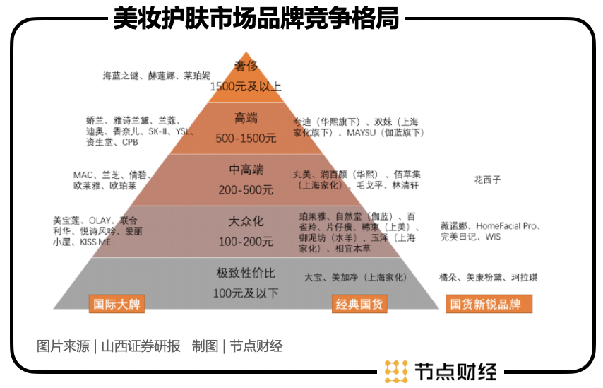 高端及以上則由國外巨頭把持,以雅詩蘭黛、蘭蔻、資生堂、LVMH為代表,分食金字塔塔尖約一半的市場份額,也拿走了價(jià)值鏈高地的大部分利潤。