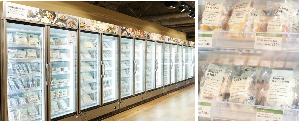 為幫助每天生活忙碌的都市上班族解決一日三餐,除熟食便當外,MUJIcom東池袋店尤其強化了冷凍食品的品類,如可用微波爐加熱的雜糧飯團,用平底鍋10分鐘便可烹制的半成品配菜包(meal kit),并且首次投入無印良品開發(fā)的冷凍食品新商品“鰻魚卷”和“蛋卷”。