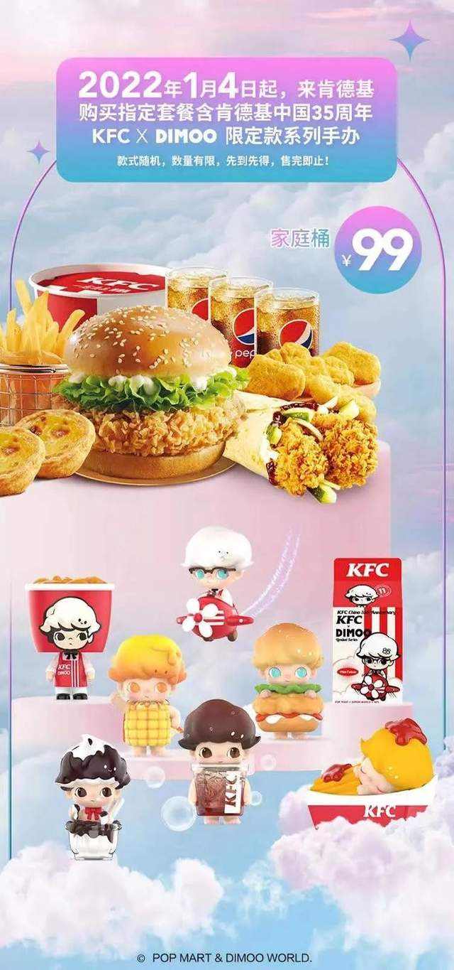 1月4日,肯德基推出定價(jià)99元的DIMOO盲盒套餐。依據(jù)肯德基的銷售規(guī)則,每買一份99元的DIMOO套餐,就可得到一個(gè)盲盒。DIMOO是泡泡瑪特的頭部IP之一,深受粉絲喜愛。